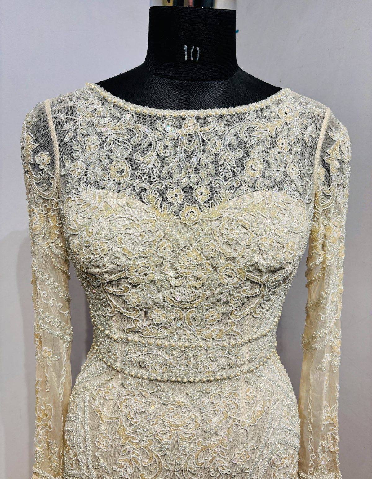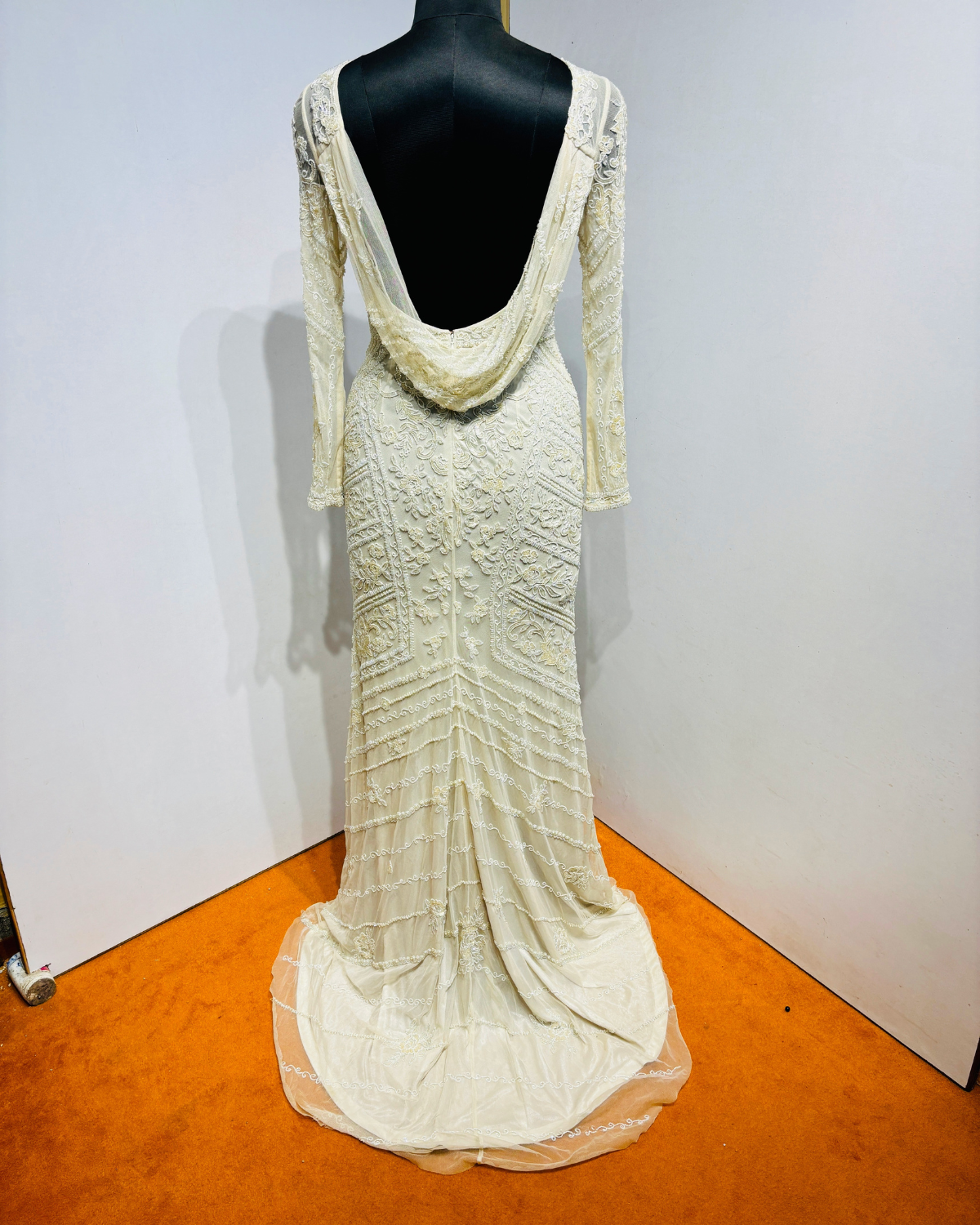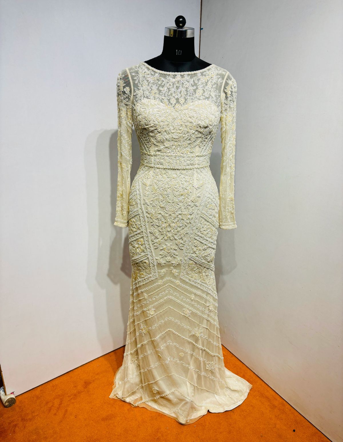 Exude timeless elegance in this ivory evening gown, crafted with intricate all-over embroidery on a sheer base. The fitted silhouette features full-length embroidered sleeves, a refined round neckline, and a striking deep back design with soft draped detailing.